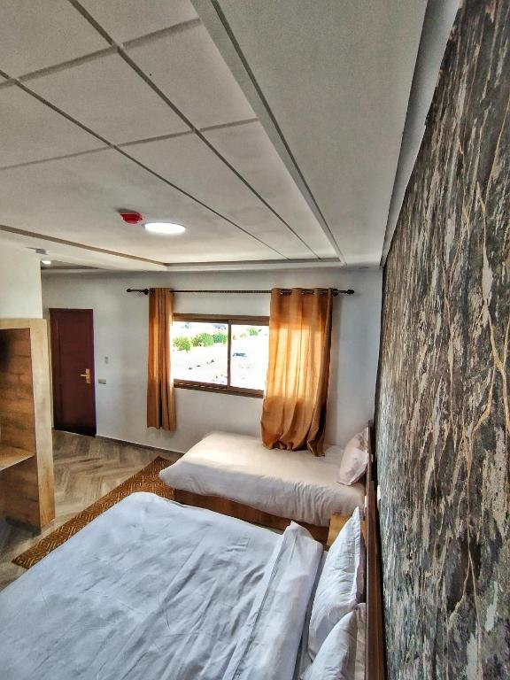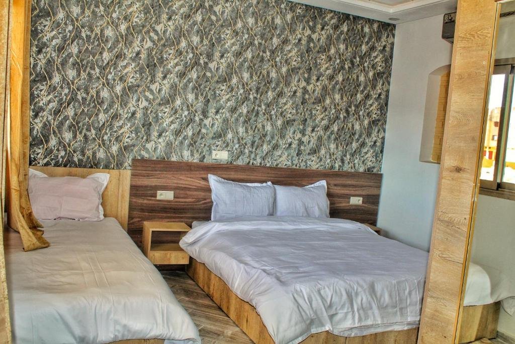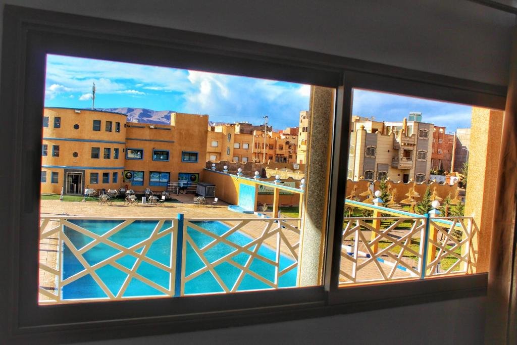 Offrez-vous un séjour tout en confort dans notre Chambre Triple avec vue sur la piscine, parfaite pour les familles ou les amis en voyage à Errachidia.